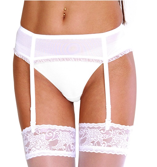Elegantný biely podväzkový pás, ktorý je vyrobený z jemnej čipky s kvetinovým vzorom. Podväzkový pás sa zapína v zadnej časti pomocou dvojstupňových háčikov. Vhodné kombinovať s podväzkovými pančuchami.